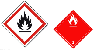 ③注意:GHS的危險化學(xué)品的圖形標(biāo)志與TDG危險貨物的運輸圖形標(biāo)志的圖形相似,底色和圖形顏色不一樣。