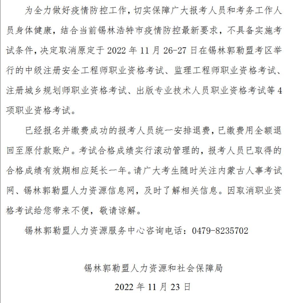 錫林郭勒盟取消舉行2022年安全工程師考試的公告