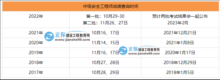 中級(jí)注冊(cè)安全工程師成績(jī)查詢時(shí)間一般會(huì)在考后2-3個(gè)月,小編列舉近幾年中級(jí)注冊(cè)安全工程師成績(jī)查詢時(shí)間,以便大家參考一下: