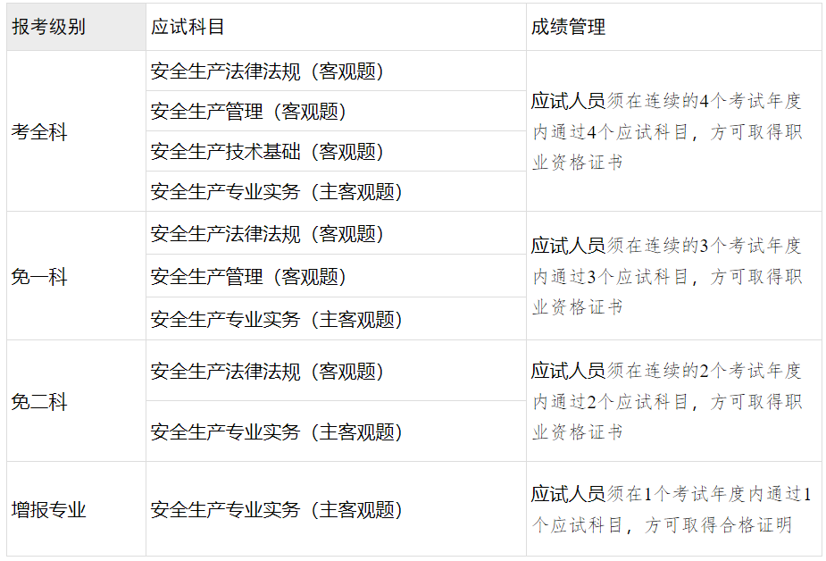 注:《安全生產(chǎn)法律法規(guī)》、《安全生產(chǎn)管理》、《安全生產(chǎn)技術(shù)基礎(chǔ)》為公共科目,《安全生產(chǎn)專業(yè)實務(wù)》為專業(yè)科目。其中,專業(yè)科目分煤礦安全、金屬非金屬礦山安全、化工安全、金屬冶煉安全、建筑施工安全、道路運輸安全和其他安全(不包括消防安全)7個專業(yè)類別。