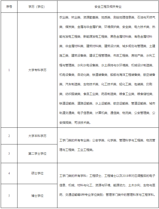 報(bào)名條件中“安全工程及相關(guān)專業(yè)”,按照《應(yīng)急管理部辦公廳關(guān)于印發(fā)<注冊(cè)安全工程師職業(yè)資格考試安全工程及相關(guān)專業(yè)參考目錄>的通知》(應(yīng)急廳函〔2019〕410號(hào))執(zhí)行,《注冊(cè)安全工程師職業(yè)資格考試安全工程及相關(guān)專業(yè)參考目錄》見附件2。