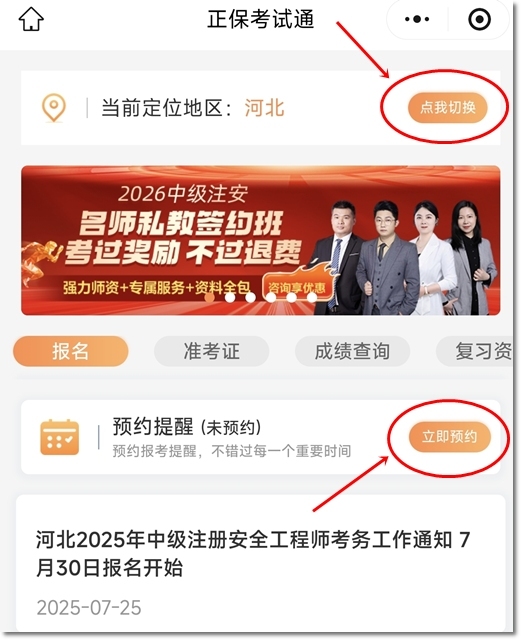 2.在頂部位置切換至自己所在的地區(qū),然后點擊“立即預(yù)約”,即可成功訂閱報名、準考證打印、查分等通知。