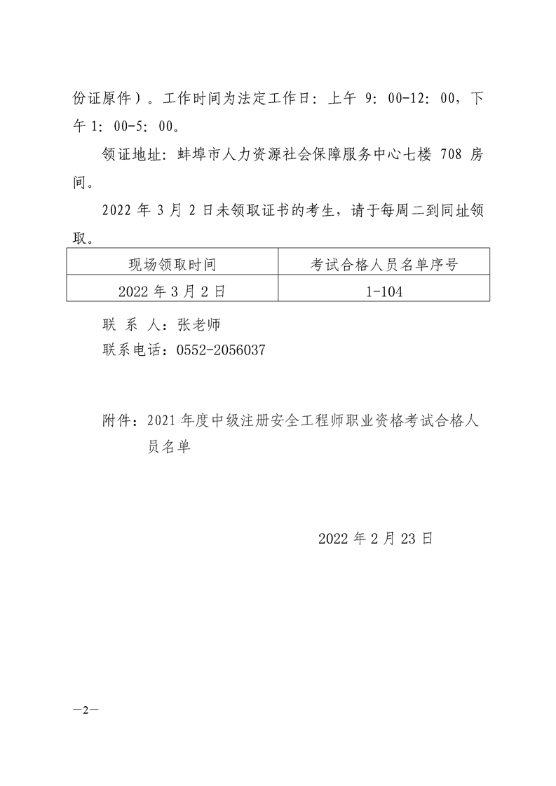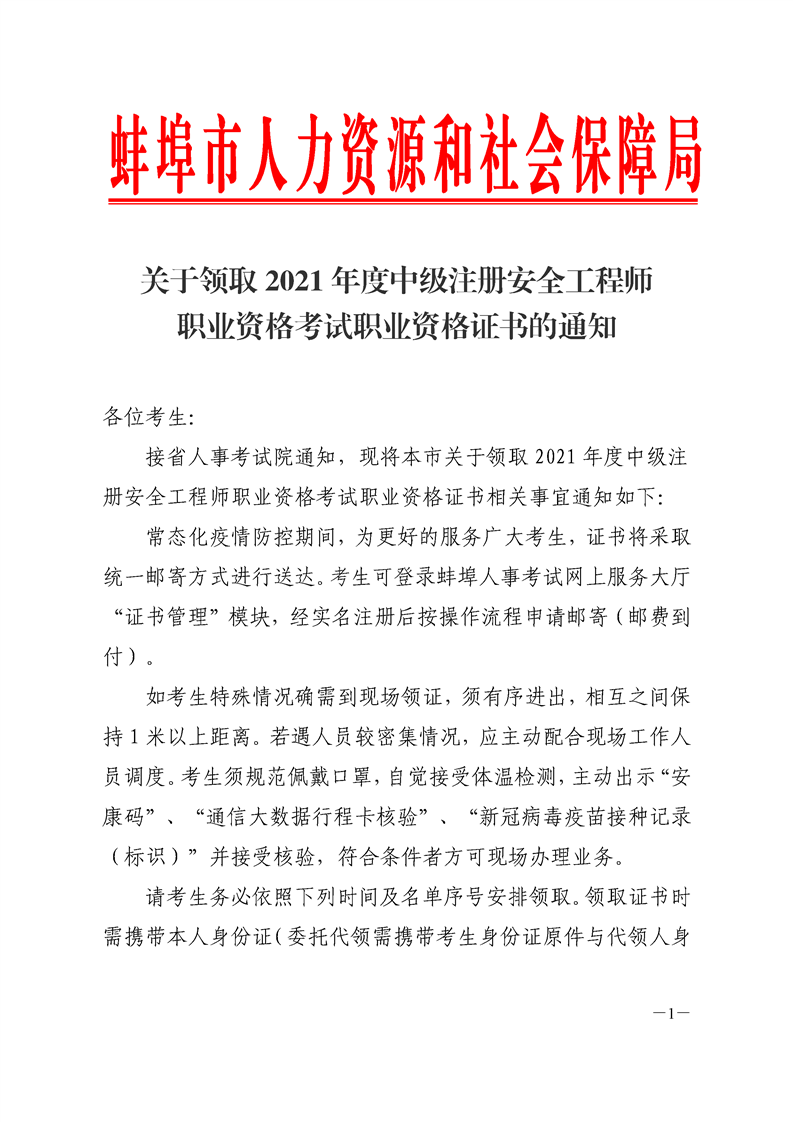 關(guān)于領(lǐng)取2021年度蚌埠中級(jí)注冊(cè)安全工程師職業(yè)資格考試證書的通知
