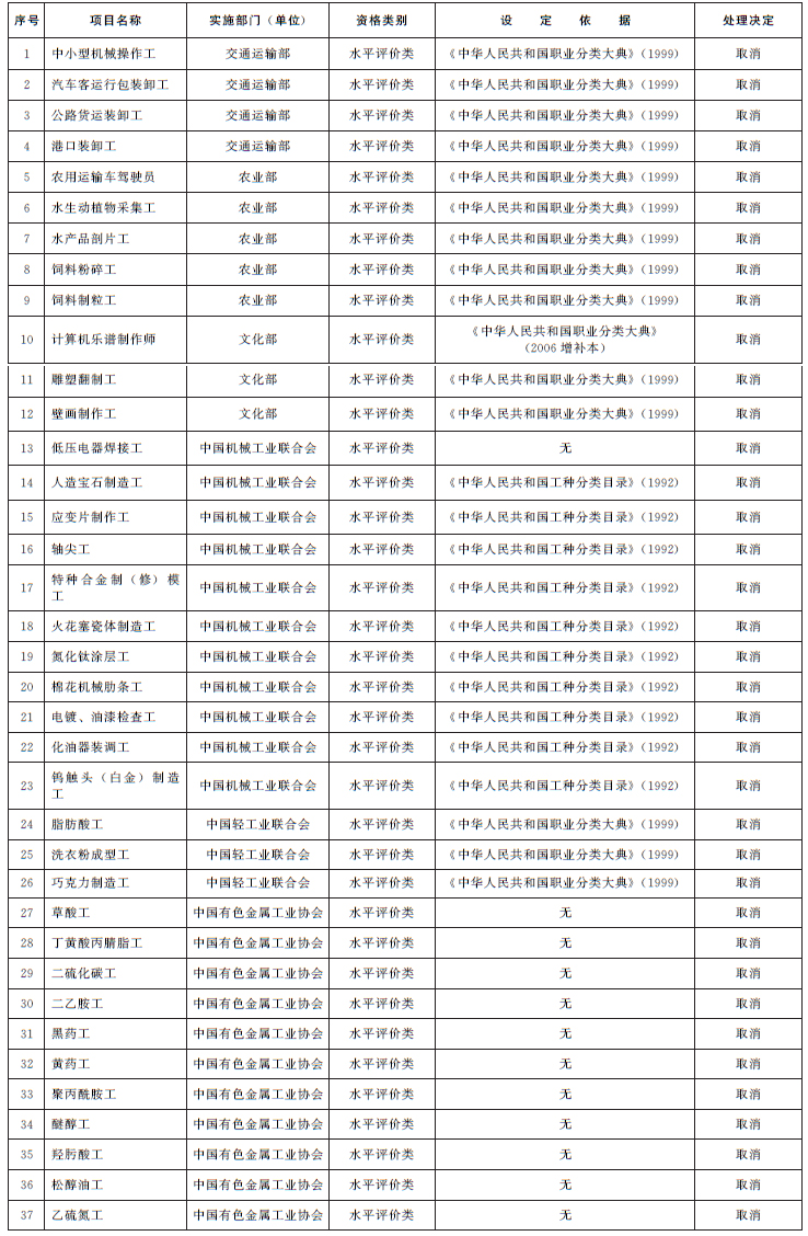 二、取消的技能人員職業(yè)資格許可和認定事項(共計37項,均為水平評價類)