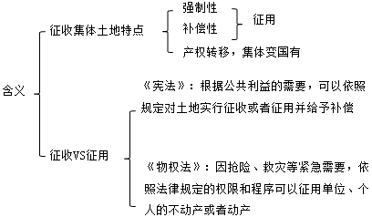 集體土地及征收集體土地的特點(diǎn)-知識(shí)點(diǎn)回顧 【例題】《憲法》規(guī)定,國家為了公共利益的需要,可以依照法律規(guī)定對(duì)土地實(shí)行( )并給予樸償。 A.征收 B.征用 C.征收或者征用 D.征購 『正確答案』C 『答案解析』本題考查的是征收集體土地的特點(diǎn)?!稇椃ā芬?guī)定:國家為了公共利益的需要,可以依照法律規(guī)定對(duì)土地實(shí)行征收或者征用并給予補(bǔ)償。參見教材P41。