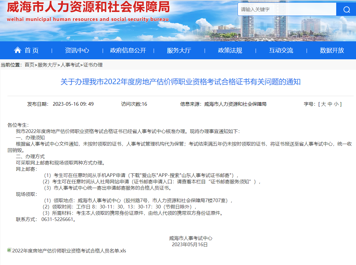 威海市人力資源和社會保障局官網(wǎng)于2023年5月16日發(fā)布【關于辦理威海市2022年度房地產(chǎn)估價師職業(yè)資格考試合格證書有關問題的通知】,辦理方式有以下兩種:
