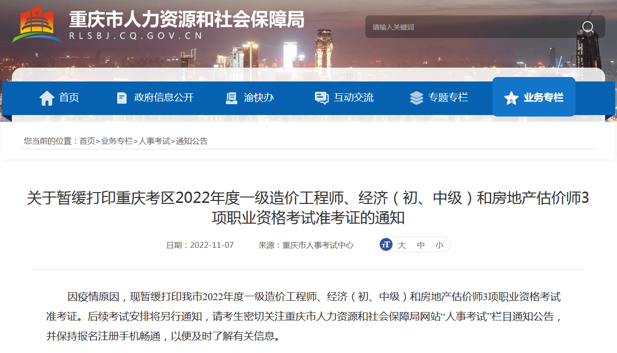關(guān)于暫緩打印重慶考區(qū)2022年度一級(jí)造價(jià)工程師、經(jīng)濟(jì)(初、中級(jí))和房地產(chǎn)估價(jià)師3項(xiàng)職業(yè)資格考試準(zhǔn)考證的通知