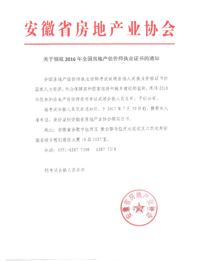 安徽省2016年全國房地產(chǎn)估價(jià)師執(zhí)業(yè)證書領(lǐng)取的通知: