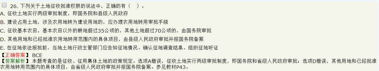 【解析】本題考查的是征收集體土地的政策規(guī)定。征收土地批準權(quán)限的規(guī)定:(1)征收土地實行兩級審批制度,即由國務(wù)院和省級人民政府審批;(2)建設(shè)占用土地,涉及農(nóng)用地轉(zhuǎn)為建設(shè)用地的,應(yīng)辦理農(nóng)用地轉(zhuǎn)用審批手續(xù);(3)征收基本農(nóng)田,基本農(nóng)田以外的耕地超過35公頃的,其他土地超過70公頃的,由國務(wù)院審批;(4)其他用地和已經(jīng)批準農(nóng)用地轉(zhuǎn)用范圍內(nèi)的具體項目,由省級人民政府審批并報國務(wù)院備案。參見教材P43.