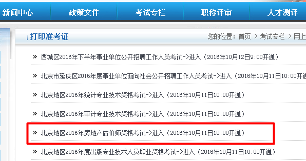 北京人事考試網(wǎng)公布2016年房地產(chǎn)估價師準考證打印入口