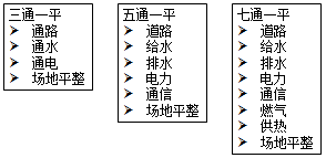 (3)熟地——完善的基礎(chǔ)設(shè)施+場(chǎng)地平整,可直接建造建筑物;有“三通一平”、“五通一平”和“七通一平”三種情況。