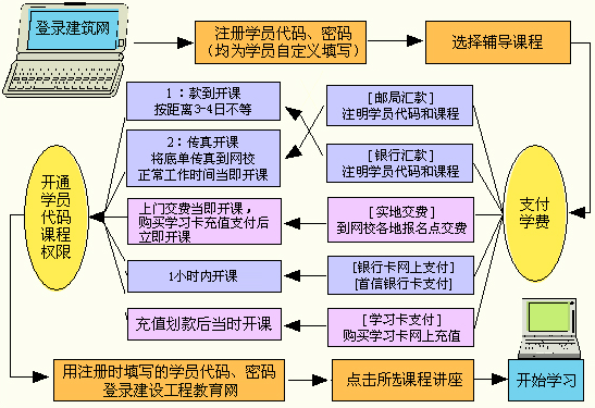 備注:如果是通過在網(wǎng)校各地學(xué)習(xí)卡代理商那里購(gòu)買學(xué)習(xí)卡支付學(xué)費(fèi)的,則流程中將省去郵局、銀行匯款,網(wǎng)上支付、發(fā)傳真等項(xiàng),而且課程是當(dāng)時(shí)充值、當(dāng)時(shí)開通的。