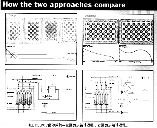 為了彌補傳統(tǒng)儲冰系統(tǒng)的這些缺點,瑞士 DELROC AG 公司發(fā)展出了一套混合式(hybrid)的儲冰系統(tǒng)。這種系統(tǒng)的熱交換器管排(heat exchanger mats)系以穩(wěn)態(tài)聚丙烯(stabilized polypropy-lene)材料所制成,循環(huán)液依然是乙二醇。但是,此款機種的特性則為同步雙回路循環(huán),其目的系將「直接溶冰式」系統(tǒng)中的冷卻水回路整合于間接溶冰法的作業(yè)中,藉此來彌補先前所提之內(nèi)部溶冰原理的缺失。當傳統(tǒng)「間接溶冰式」系統(tǒng)在執(zhí)行溶冰時,儲冰(ice bank)與熱交換器管壁之間會逐漸形成寬大的間距,因此冰塊與熱交換器之間的熱傳能力會減低。但是在引進了「直接溶冰式」系統(tǒng)中的冷卻水回路之后,冷卻水可將熱交換器無法完全吸收之熱再作二次吸收(詳附圖),以提高排熱效率。除此之外,經(jīng)過預冷的空氣會由儲冰槽的底部被置入槽水中,藉以攪拌提升槽水溫度的「均衡度」。