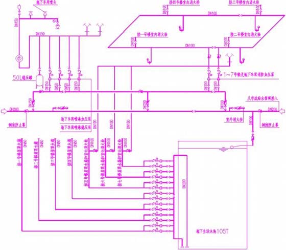 地下車庫內(nèi)設(shè)置噴淋系統(tǒng),采用穩(wěn)高壓制。