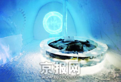 這是冰雪酒店內(nèi)配備了冰雕家具和藝術(shù)品的豪華套間。新華/路透