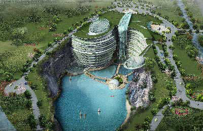 “水下2層,水面17層,坑面2層,一共約21層,只高出地平面15米左右,大部分建筑在坑里,有400個左右的房間,每間客房均設(shè)有觀景露臺!崩钚耜栠@樣介紹,酒店將依附著采石坑的南部巖壁建造,從坑底伸出地面,水面以下是水底餐廳、咖啡館和部分客房。