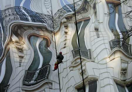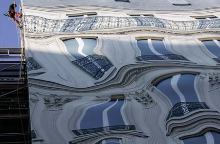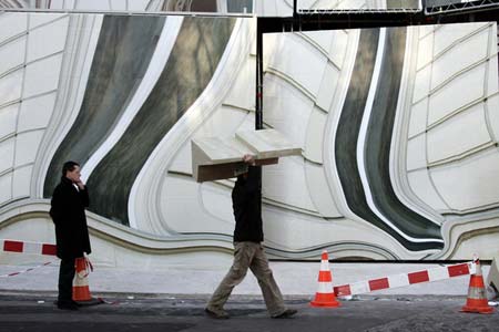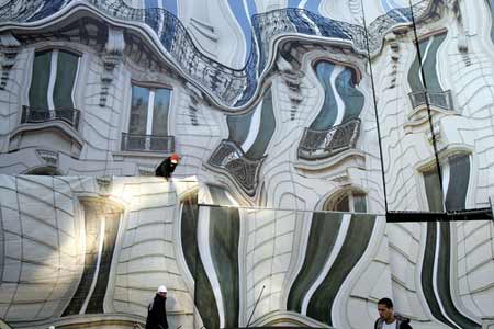 2006年12月20日,巴黎,一幢大樓外墻面重新裝修,工人用“新奇”擋板作護欄,由藝術(shù)家Pierre Lavie設計的扭曲墻體。
