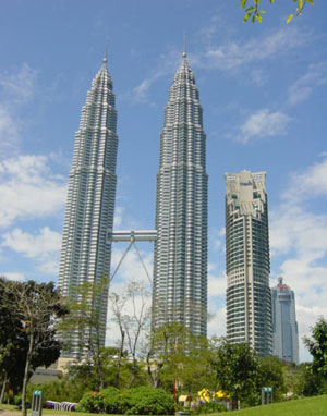 國家石油公司雙塔大樓位于吉隆坡市中心美芝律,高88層,是當(dāng)今世界名冠的超級建筑。巍峨壯觀,氣勢雄壯,是馬來西亞的驕傲。它曾以451.9 米的高度打破了美國芝加哥希爾斯大樓保持了22年的最高記錄。這個(gè)工程于1993年12月27日動工,1996年2月13日正式封頂,1997年建成使用。登上雙塔大樓,整個(gè)吉隆坡市秀麗風(fēng)光盡收眼底,夜間城內(nèi)萬燈齊放,景色尤為壯美。