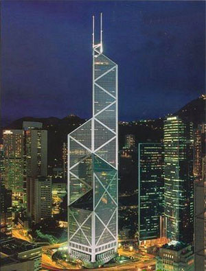 香港中國銀行大廈,由貝聿銘建筑師事務(wù)所設(shè)計(jì),1990年完工?偨ㄖ娣e12.9萬平方米,地上70層,總高369米。結(jié)構(gòu)采用4角12層高的巨形鋼柱支撐,室內(nèi)無一根柱子。