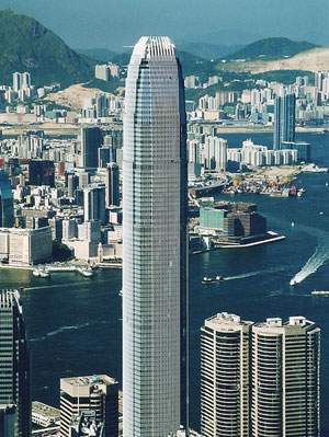 位于香港中環(huán)的國際金融中心一期1998年竣工,高39層,180米,自建成后便吸引了不少國際金融機(jī)構(gòu)進(jìn)駐。國金二期2003年落成,高 420米,共88層,為香港最高建筑物。被稱為“驚世之作”的香港國際金融中心二期外形設(shè)計(jì)概念是以一個(gè)向外地的朋友“招手”的手勢,向海外朋友表示“歡迎您”的意思。