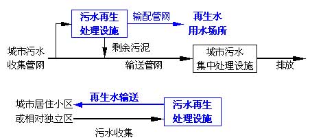 城市污水再生利用系統(tǒng):集中型、就地(小區(qū))型和建筑中水系統(tǒng)簡(jiǎn)示如下: