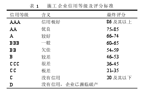 根據(jù)記分標(biāo)準(zhǔn)對(duì) 6 類 19 個(gè)指標(biāo)分別打分,相加后得最終評(píng)分值,以判定施工企業(yè)的信用等級(jí)。國(guó)際上通用的信用等級(jí)及評(píng)分標(biāo)準(zhǔn)見表 1.