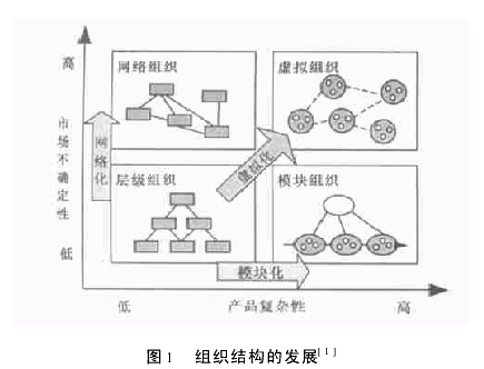 自從20世紀初泰勒的科學管理理論建立以來,傳統(tǒng)的強調(diào)分工和集權(quán)的組織理論也隨之形成。但是最近幾十年來對于許多組織而言,市場和競爭狀況發(fā)生了巨大的變化,過去的靜態(tài)環(huán)境已經(jīng)不復存在。因此,傳統(tǒng)的層級組織必須相應地進行變革,以滿足動態(tài)環(huán)境的需求。組織的變革主要包括模塊化、網(wǎng)絡化以及虛擬化等三個基本策略,它們分別適用于不同的前提條件,如圖1所示。