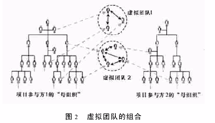 (7)虛擬團隊的組合:虛擬團隊的成員是來自于各個項目參與方的“母組織”。虛擬團隊的成員組合不是基于“母組織”的結(jié)構(gòu),而是基于所處理任務所需要的能力。根據(jù)任務處理的需求,合適的人員將從“母組織”中脫離,并組合為動態(tài)的時間上有限的虛擬團隊。在成功完成其任務之后,虛擬團隊解散,團隊成員重新返回到原來的“母組織”。圖2說明了虛擬團隊的組合。需要說明,這里的虛擬團隊1和虛擬團隊2可以從事同一個項目,也可以是不同的項目。也就是說,一個項目參與方可以同時參與多個項目,可以是多個虛擬組織的參與方。