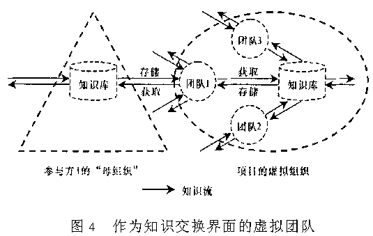 (1)組織結(jié)構(gòu):項目參與方“母組織”內(nèi)部運營的組織結(jié)構(gòu)可以是傳統(tǒng)的層級結(jié)構(gòu),而其產(chǎn)生的虛擬團隊與其他虛擬團隊一起構(gòu)成了項目的虛擬組織。任何一種組織結(jié)構(gòu)都有其適用范圍和優(yōu)缺點。從知識管理的角度出發(fā),項目參與方“母組織”內(nèi)部運營的層級結(jié)構(gòu)是長期的穩(wěn)定的,有利于利用和積累知識;而項目的虛擬組織的結(jié)構(gòu)是短期的不穩(wěn)定的,有利于分享和創(chuàng)造知識。