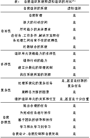 同樣的,如果一個組織對外界封閉,則必然會導致活力的喪失,因而幾乎所有新的組織理論都把企業(yè)描述為一個開放系統(tǒng)。事實上,自我組織在組織理論中并不是一個完全新的概念,諸如自主的工作團隊、靈活的工作時間、分散化和代理、以及協(xié)作式的領導等等都隱含了自我組織的思想。自我組織的組織系統(tǒng)通常具備高度的靈活性、創(chuàng)造性并且能夠在極大程度地激發(fā)組織成員的潛力。按照系統(tǒng)論的觀點,具備高度開放性和動態(tài)性等特征的虛擬組織是典型的自我組織的組織系統(tǒng)。虛擬組織完全符合自我組織系統(tǒng)的四個基本特征,即自治性、多樣性、復雜性和自我參照性,如表1所示。虛擬組織中的大多數(shù)組織關系其實就是自我組織過程的結(jié)果,這種自發(fā)的過程很少需要由領導人員去進行有意識的規(guī)劃和控制,自我組織的組織機制保證了虛擬組織的強大生命力。