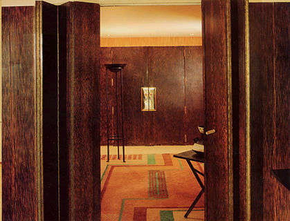 3.Eugène Printz設計的屋內(nèi)滑動棕櫚大門把玄關和起居室分隔開。這道大門借鑒了屏風的原理,半開半合時,和室內(nèi)另一頭的門互相呼應。