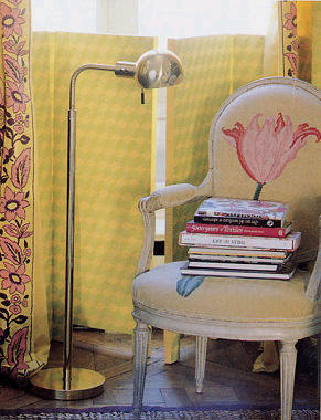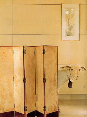 1.讓。米歇爾。法蘭克設計的桃木羊皮紙面屏風。屏風后巧妙地放置了一件綿羊雕塑,悄悄地探出頭來,使得藝術品在家中不至于顯得過于突兀。