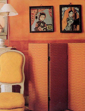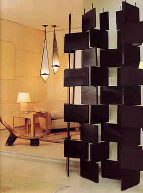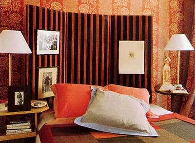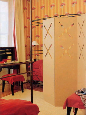 5.伊弗。哈拉特設計的條紋布料屏風,色調(diào)凝重。在屏風上不規(guī)則地掛幾幅畫,又成了居室里的一道風景線。