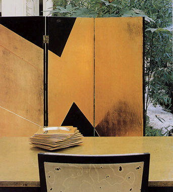 7.表面飾以金箔的1931年產(chǎn)日式屏風,由Hamanaka出品,風格獨一無二。此處,屏風把餐廳和花園恰倒好處地一隔為二。