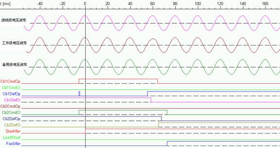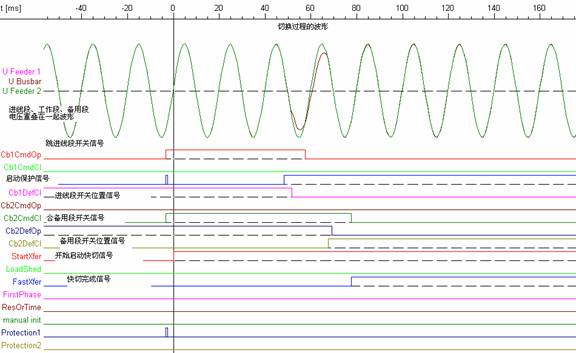對于不間斷的切換,快速切換裝置進(jìn)行了快速切換,在母線和備用饋線同步的情況下,合分閘命令同時(shí)被快速切換裝置發(fā)出到斷路器。