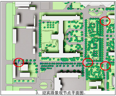 1.迎賓路景觀由一條主線和若干節(jié)點組成。主線指中心花園主干道,節(jié)點為穿插布置在主干道兩側(cè)的景觀節(jié)點。主干道的各個細節(jié)布置保持了視覺的持續(xù)性,在重要節(jié)點設(shè)置色彩豐富的小型花鏡和富有現(xiàn)代氣息的標語。