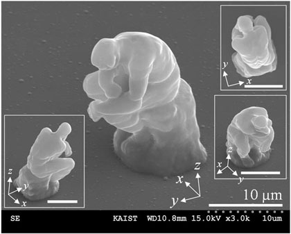 韓國科學家表示,此新技術將有助于開發(fā)新穎的生物傳感器和其它精密微型儀器。過去十多年,全世界的研究人員都在嘗試利用激光創(chuàng)作精微三維作品。起初,他們利用一種碰到某種頻率的光就變硬的樹脂進行嘗試。通過多個激光束,研究人員讓雕塑作品栩栩如生起來,甚至不到可見光波長大的點點細節(jié)也能充分表現出來。