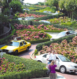 如果要較真,花街并非世上最陡的街,就在舊金山城里,費(fèi)爾伯特街與二十二街分別都有31度的坡面。當(dāng)然了,坊間傳說(shuō)都咬定花街有40度。這更加說(shuō)明其陡峭感在人的視覺(jué)及心理上已造成多大震撼。對(duì)有興趣的游客還得補(bǔ)充一句,山上停車可不是沿著路停的,那樣停,車子很可能就滑到山下去了。你就跟著大家把車停成與路面成交叉垂直的角度,也就是說(shuō),把車橫在路上吧。