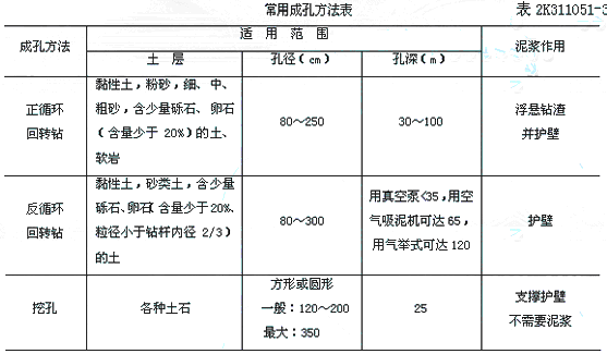 答:鉆孔灌注樁法常用的成孔方法,適用范圍及泥漿的作用見表2K311051-3