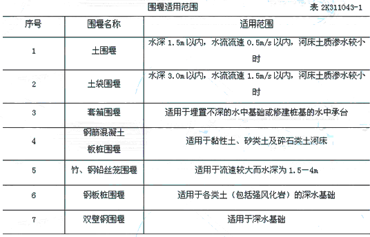 答:各種圍堰的適用范圍(見表2K311043-1):