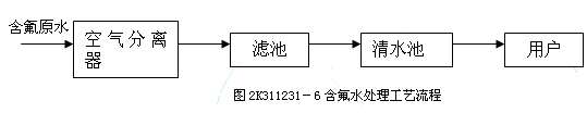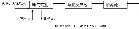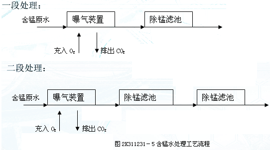 后者通常設置曝氣裝置和接觸化濾池,一般選擇一段處理,當錳的含量比較高時,可以在一段處理后面再加一段處理過程,如圖2K311231