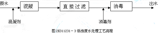 答:當原水濁度很低時,可以省去沉淀構筑物,將原水加入混凝劑,然后直接過濾,如圖2K311231-3但是在生活飲用水處理中,過濾是必不可少的步驟。