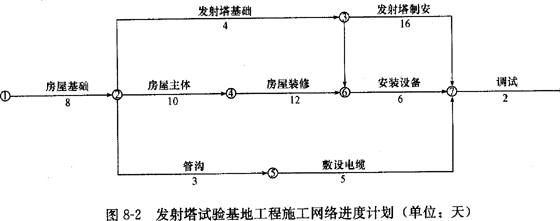 某施工單位(乙方)與某建筑單位(甲方)簽訂了建造無線電發(fā)射試驗基地施工合同。合同工期為38天。由于該項目急于投入使用,在合同中規(guī)定,工期每提前(或拖后)1天獎(罰)5000元。乙方按時提交了施工方案和施工網(wǎng)絡(luò)進度計劃(如圖8-2所示),并得到甲方代表的同煮。
