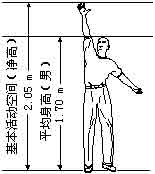 人的基本活動空間與房屋層高之間的空間關(guān)系編制國家標(biāo)準(zhǔn)《房產(chǎn)測量規(guī)范》的前期,我們在《房產(chǎn)測量規(guī)范》的“征求意見稿”中,對房屋空間的最低標(biāo)準(zhǔn)是要求房屋內(nèi)的凈高不低于2.05 m ;但經(jīng)過廣泛調(diào)研和討論,大家認(rèn)為房屋的層高易于操作和掌握,最后仍統(tǒng)一采用層高不低于2.20 m 的標(biāo)準(zhǔn)。