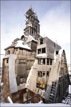 俄羅斯阿爾漢格爾斯克市60歲男子尼古萊·蘇蒂亞金在過去15年中造出了一座世界上最高的“木樓房”,這座木屋有13層樓,高達(dá)44米,它被蘇蒂亞金稱做是“世界第八奇跡”。