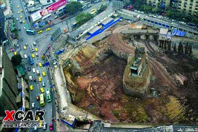 重慶一處樓盤十米深的地基中央留下一棟拒絕拆遷的房屋,網(wǎng)友爭睹這一奇觀