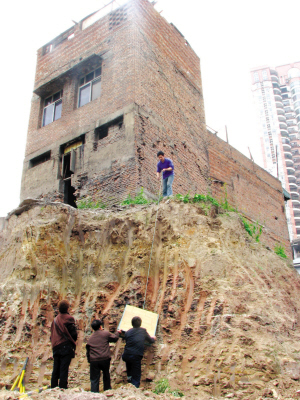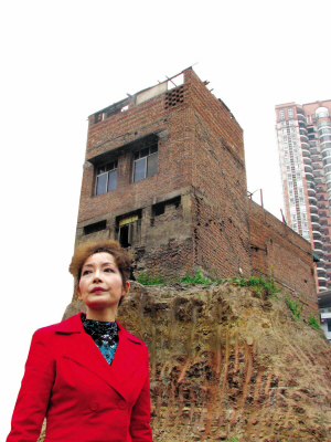 進(jìn)入樓盤大坑基地下面,十多米土堆上的房子,在四周高樓林立的背景下顯得愈加刺眼。順著未拆房子的左側(cè)往上看,記者們看到了一幢有著“都市桃源”四個(gè)大字的寫字樓,“但愿這兒將來(lái)也變成桃源”,現(xiàn)場(chǎng)有人意味深長(zhǎng)地說(shuō)。