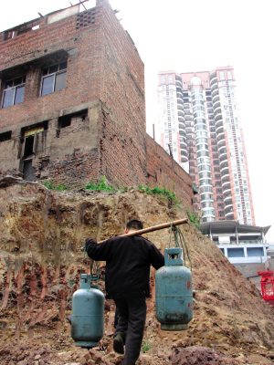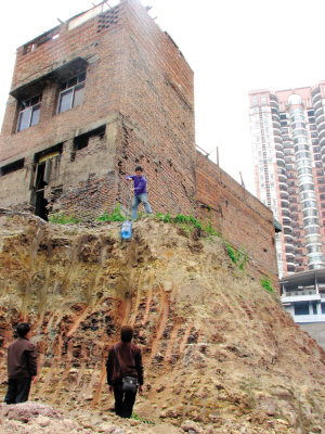 工地的四面全是高樓大廈,中間一個(gè)偌大的坑里,十多米的兩層破敗小樓房孤零零豎立著,這樣的場(chǎng)景在現(xiàn)代化的都市里確算一個(gè)“奇觀”。今年3月初,這樣場(chǎng)景的照片開始在各大網(wǎng)站論壇里流傳,因畫面沖擊力強(qiáng),引起社會(huì)廣泛關(guān)注,戶主也因此得名“最牛的釘子戶”。