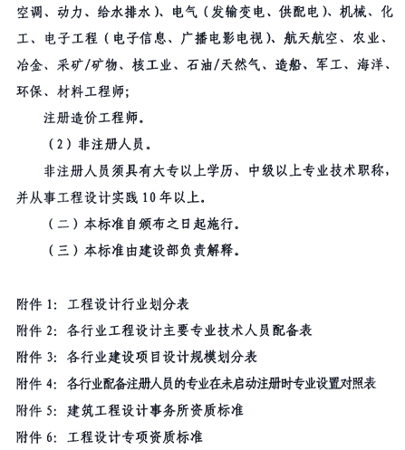 根據(jù)《建設(shè)工程勘察設(shè)計(jì)管理?xiàng)l例》和《建設(shè)工程勘察設(shè)計(jì)資質(zhì)管理規(guī)定》,我部制定了《工程設(shè)計(jì)資質(zhì)標(biāo)準(zhǔn)》,現(xiàn)印發(fā)給你們,請遵照執(zhí)行。原《關(guān)于頒發(fā)工程勘察資質(zhì)分級標(biāo)準(zhǔn)和工程設(shè)計(jì)資質(zhì)分級標(biāo)準(zhǔn)的通知》(建設(shè)[2001]22號(hào))中“工程設(shè)計(jì)資質(zhì)分級標(biāo)準(zhǔn)”同時(shí)廢止。其他有關(guān)規(guī)定與本標(biāo)準(zhǔn)不符的,以本標(biāo)準(zhǔn)為準(zhǔn)。執(zhí)行中有何問題,請與我部建筑市場管理司聯(lián)系。