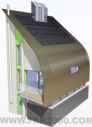 4月16日報(bào)道,由Sheppard Robson、Arup和Kingspan聯(lián)合打造的“零碳排放”房屋,結(jié)合了PVs、生物科技和“風(fēng)斗”(wind catcher)。